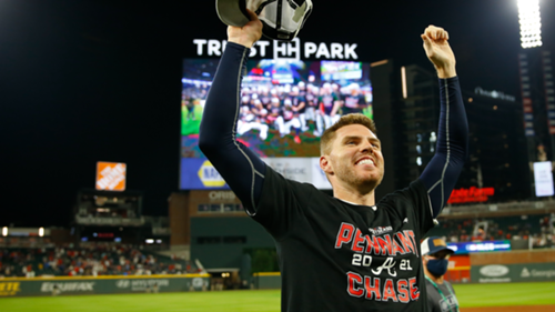 :" Advertisement "," forceLoad ": false" data-slot-id="/ 22299846845/SportingNews/SportingNews _ Web/Articles/In-Article _ Banner "id=" ad-inArticleBanner1" > With the Braves linked 4-4 versus the Makers in all-time low of the 8th inning in Game 4 of the NLDS, Freeman hit a solo home run to put Atlanta up 5-4, eventually leading to the 3-1 series win to send the group to the NLCS for the 2nd year straight.